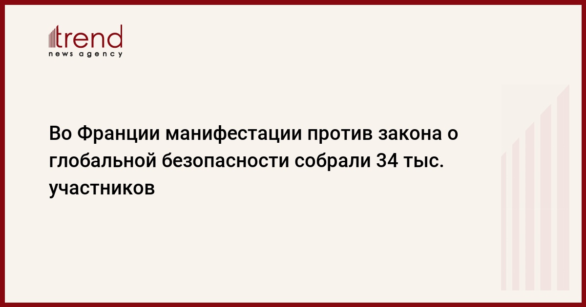 По меньшей мере 34 тыс. человек приняли участие в акциях протеста против принятия закона "о глобальной безопасности" в эту субботу во Франции. Об этом сообщил телеканал BFMTV со ссылкой на данные МВД, передает Trend со ссылкой на ТАСС.