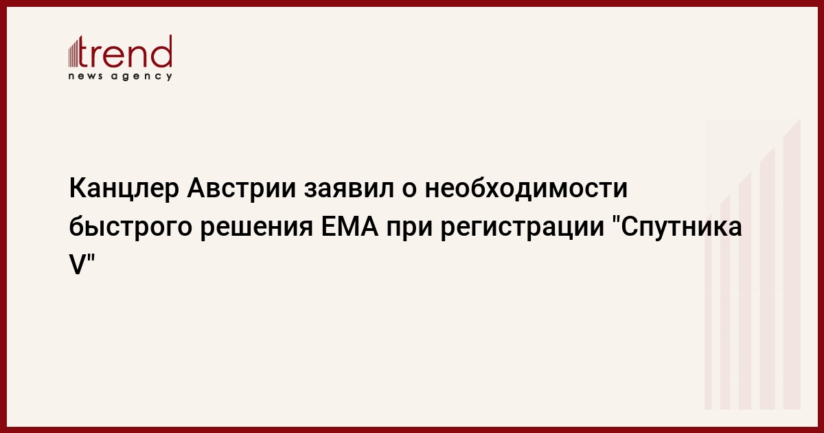 4 мая Курц сообщил, что Австрия завершила переговоры о контракте на закупку российской вакцины "Спутник V" и ожидает решения EMA о ее регистрации для использования препарата. Ранее Курц отмечал, что поставка в Австрию "Спутник V" будет реализована только после ее регистрации EMA.