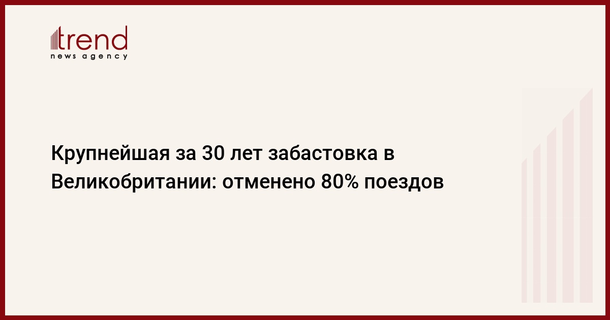 По всей Великобритании отменили 80% поездов, передает Trend со ссылкой на «Казинформ». На забастовку вышли профсоюзы компании, которая обслуживает большую часть железных дорог королевства, включая все крупные вокзалы Лондона.