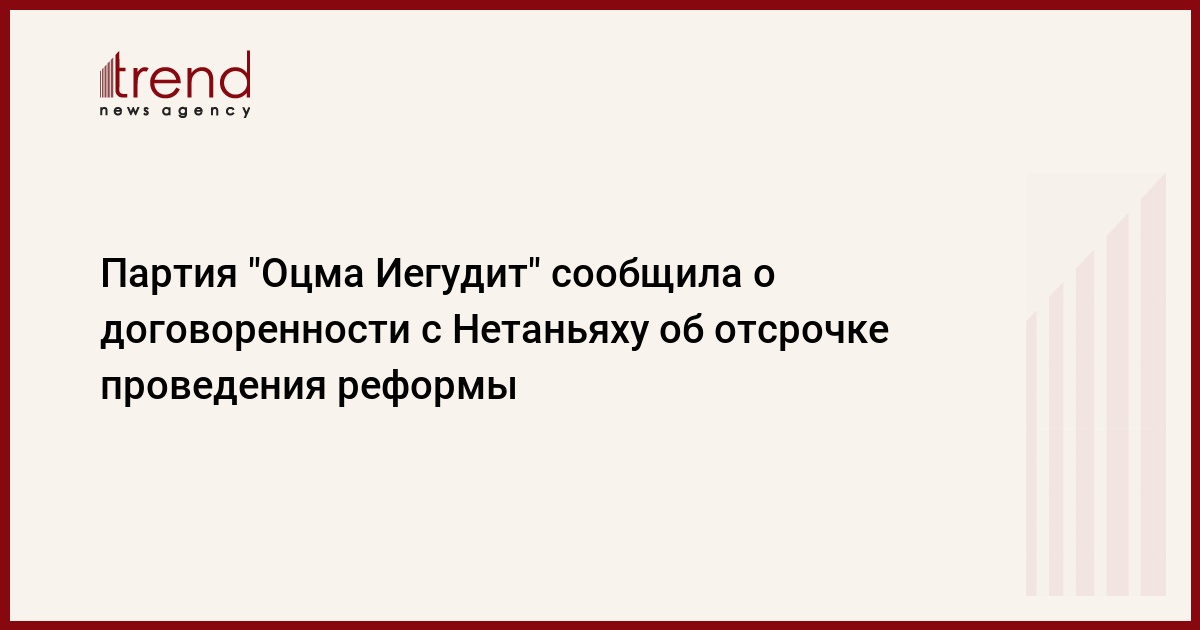 БАКУ /Trend/ - Партия "Оцма Иегудит" распространила заявление, в котором говорится, что между премьер-министром Израиля Биньямином Нетаньяху и министром национальной безопасности достигнута договоренность, согласно которой проведение юридической реформы может быть перенесено на летнюю сессию Кнессета.