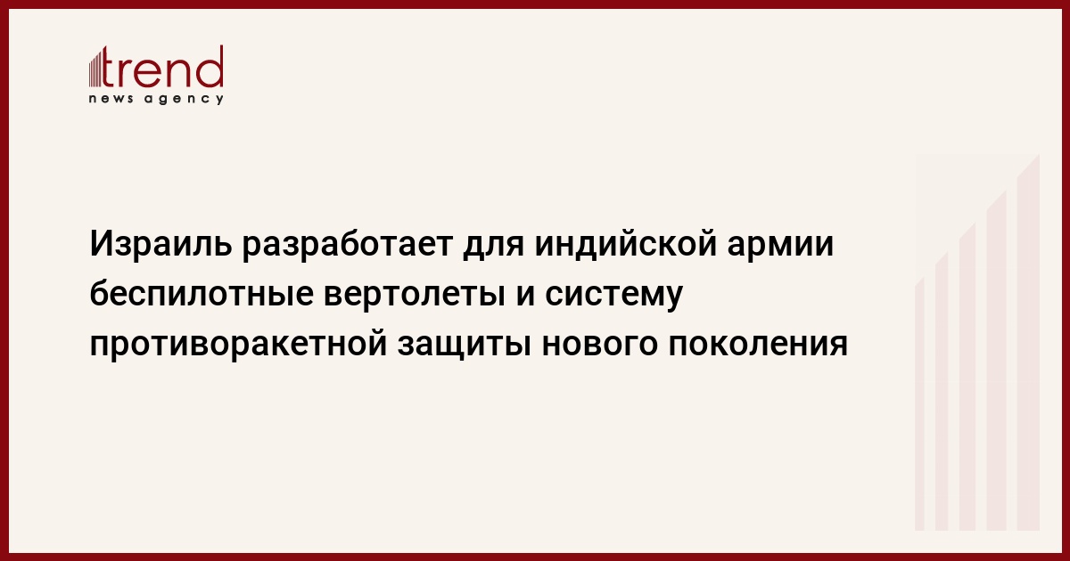Израиль, Иерусалим /корр. Trend Й.Мишиев/ Израиль разработает беспилотные вертолеты и систему противоракетной защиты нового поколения для индийской армии, сообщает американский еженедельник "Defense News".