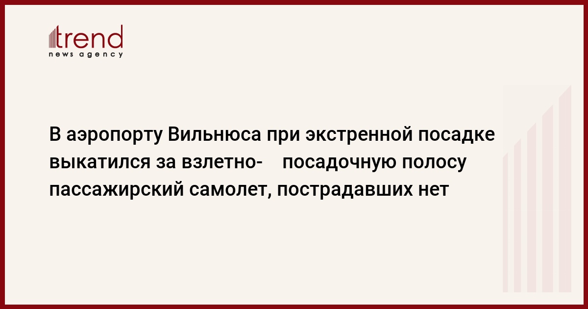 В аэропорту Вильнюса /Литва/ сегодня при экстренной посадке выкатился за взлетно- посадочную полосу самолет Dash 8-400 скандинавской авиакомпании SAS с 48 пассажирами на борту, пострадавших нет. Об этом корр.ИТАР-ТАСС сообщил представитель аэропорта по печати Арунас Марцинкявичюс.