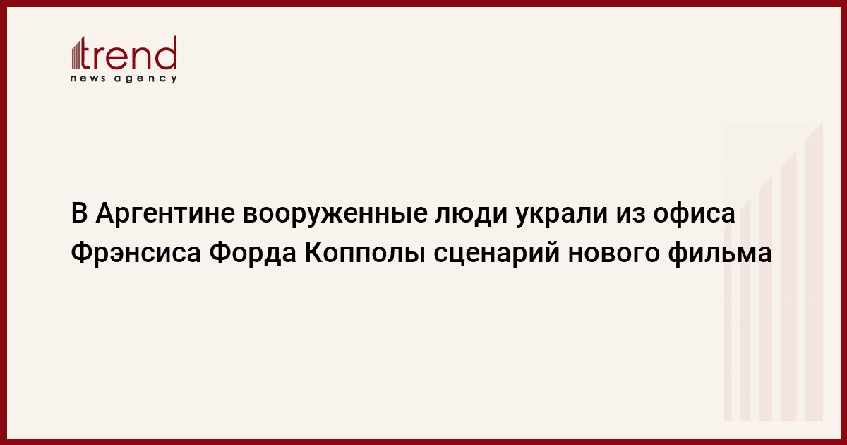 В Аргентине вооруженные люди украли из офиса известного американского кинорежиссера Фрэнсиса Форда Копполы сценарий для нового фильма Tetro, передает РБК . Во время ограбления Ф.Ф.Копполы в офисе не было. Как передают аргентинские СМИ, пятеро вооруженных преступников ворвались в помещение, связали сотрудников и забрали компьютерную технику и видеокамеры. Сценарий фильма Tetro находился на жестком диске одного из украденных компьютеров, в нем рассказывается о жизни итальянских иммигрантов. В фильме должен был сниматься Мэтт Диллон. По заявлениям представителя Ф.Ф.Копполы, текст сценария не потерян безвозвратно, поскольку был сохранен в других местах, передает Associated Press.