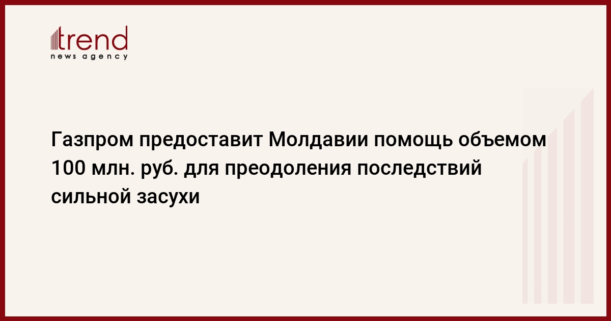 Газпром предоставит Молдавии в качестве гуманитарной помощи для преодоления последствий сильной засухи этого года около 100 млн. руб., сообщил посол Российской Федерации в Молдавии Валерий Кузьмин. Он напомнил, что ранее правительство России приняло решение о выделении Молдавии в качестве гуманитарной помощи 10 тыс. т. продовольственной пшеницы и 4 тыс. т.