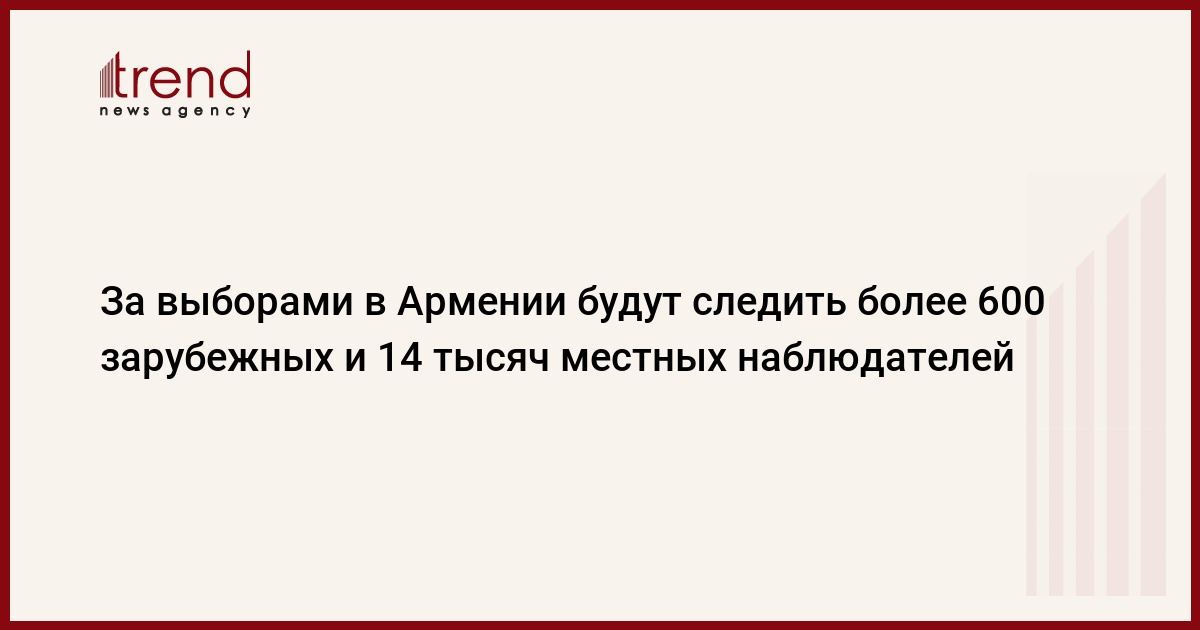 Агентство Медиамакс напоминает, что за президентскими выборами в Армении 19 февраля будут следить более 600 иностранных наблюдателей: 316 от БДИПЧ ОБСЕ, 53 - от Парламентской Ассамблеи ОБСЕ, 40 - от Парламентской Ассамблеи Совета Европы, 6 - от Европейского парламента, 166 - от СНГ, 39 - от Межпарламентской Ассамблеи СНГ.
