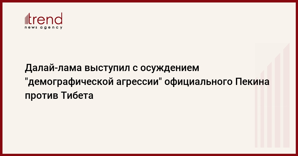 Тибетский духовный лидер далай-лама XIV (Тэнцзин Гьямцхо) выступил с осуждением "демографической агрессии" официального Пекина в отношении Тибета, сообщает РБК.