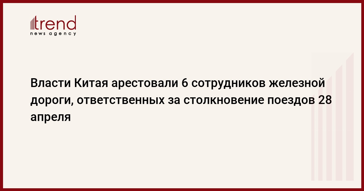 Правоохранительные органы Китая арестовали 6 сотрудников железной дороги, ответственных за столкновение двух поездов 28 апреля с.г. Как сообщили в министерстве железных дорог КНР, в числе обвиняемых - заместитель начальника управления железных дорог г.Цзинань (административный центр восточной провинции Шаньдун) Го Цзигуан, два диспетчера, дежурный вокзала и его помощник, а также машинист поезда, передает РБК со ссылкой на "Синьхуа".