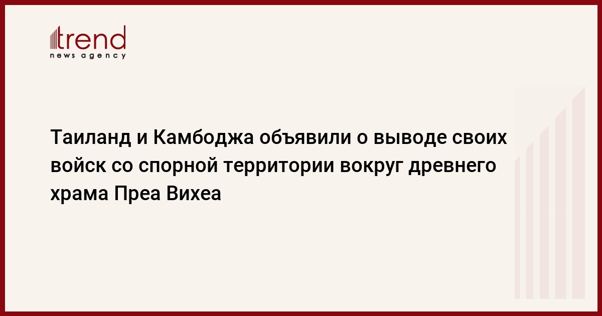 Таиланд и соседняя Камбоджа объявили о выводе своих войск со спорной территории вокруг древнего храма Преа Вихеа в попытке ослабить напряжение перед вторым раундом переговоров между министерствами иностранных дел обоих государств. Представители Таиланда отметили, что вывод их войск со спорных территорий не повлияет на способность страны защищать свой Суверенитет, передает РБК .
