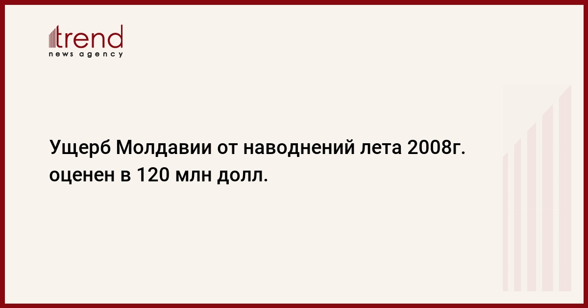Ущерб Молдавии от наводнений лета 2008г. оценивается в 120 млн долл. Как сообщили РБК в Министерстве экономики и торговли республики, к такому выводу пришла рабочая группа, занимавшаяся оценкой ущерба от паводка. Результаты ее работы были обнародованы на заседании, которое провел первый вице-премьер, министр экономики и торговли Игорь Додон. Как было отмечено, из общей суммы примерно 20% составил ущерб, нанесенный инфраструктуре из-за разрушения дорог и подъездных путей. Около 15% составил ущерб, нанесенный наводнениями сельскохозяйственным землям, 65% пришлось на недвижимость. Речь идет о пострадавших домах, магазинах, лагерях и базах отдыха, санаториях.