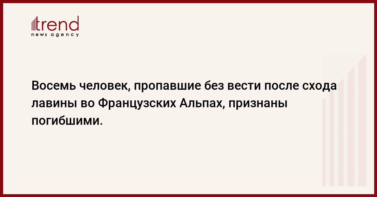 Восемь человек, пропавшие без вести после схода лавины во Французских Альпах, признаны погибшими, передает РБК со ссылкой на Associated Press. По словам представителей спасательной службы, лавина настигла группу альпинистов на одном из участков горы Мон Блан дю Такюль. "Найти кого-либо в живых шансов больше нет", - считает министр внутренних дел Франции Мишель Аллиот-Мари. Сход лавины произошел 24 августа 2008г. в 03:00 по местному времени (05:00 мск). В спасательных работах участвовали 4 вертолета, десятки спасателей, врачи, проводники и специально обученные собаки. Были спасены 7 человек. Все они доставлены в больницу. Первоначально сообщалось о 10 пропавших - пяти австрийцах, трех швейцарцах и двух итальянцах. Однако затем выяснилось, что итальянцы уже вернулись на родину.