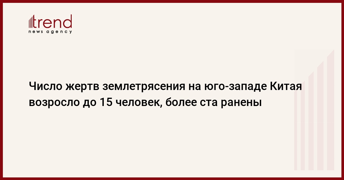 Число жертв землетрясения, произошедшего сегодня на юго-западе Китая, возросло до 15 человек, более ста получили ранения. Об этом сообщило агентство Чжунгосиньвэньшэ.