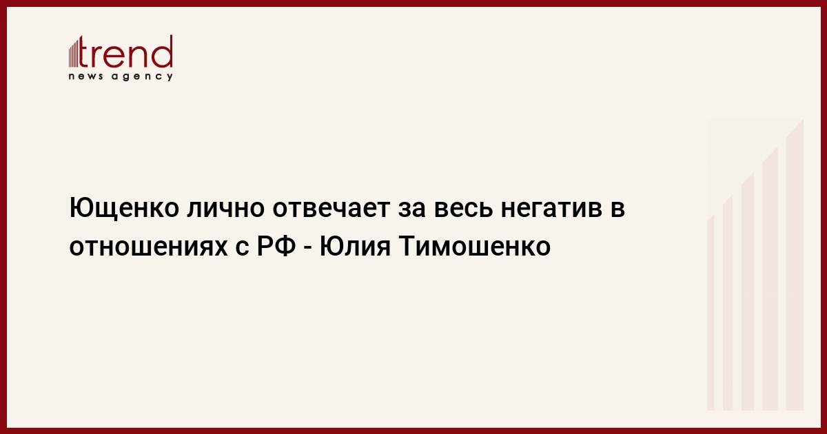 Премьер-министр Украины Юлия Тимошенко считает, что за все негативные стороны в отношениях с Россией отвечает лично прозападный президент Украины Виктор Ющенко, об этом Тимошенко заявила на пресс-конференции в среду в Киеве, отвечая на вопрос журналистов о возможном введении ограничений со стороны РФ, передает РИА Новости.