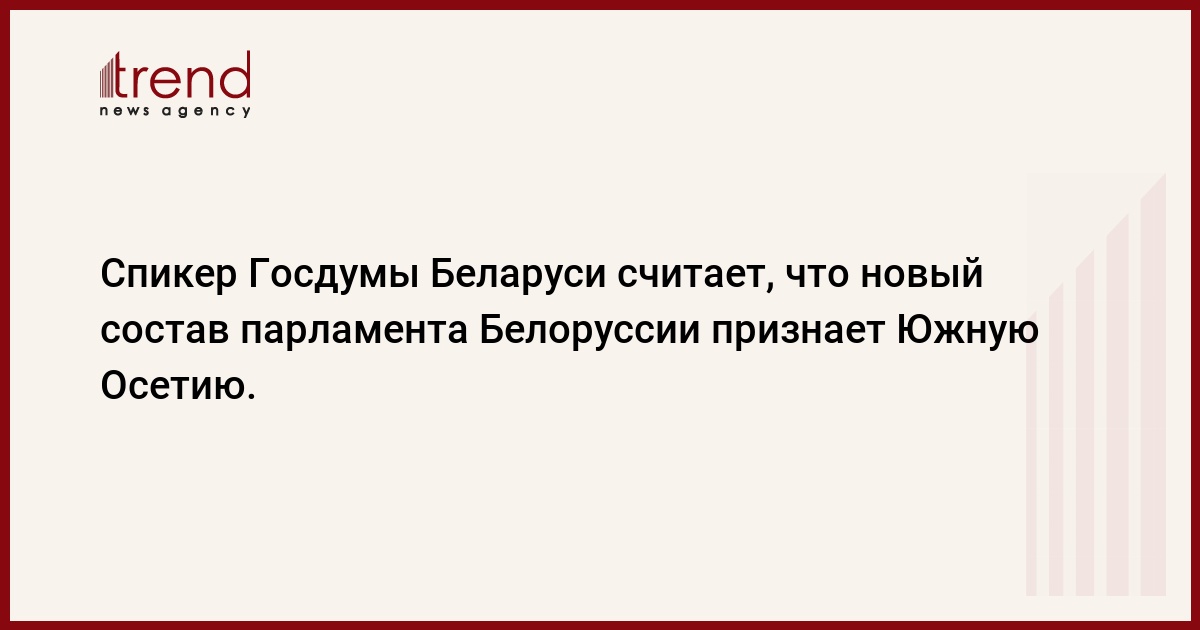 Спикер Госдумы Борис Грызлов считает, что новый состав парламента Белоруссии признает Южную Осетию, передает РБК. Такое мнение Б.Грызлов высказал сегодня в ходе встречи с руководством Южной Осетии в г.Цхинвале. Вопрос о перспективах вступления Южной Осетии в Союзное государство России и Белоруссии Б.Грызлову задал председатель южноостинского парламента Знаур Гассиев. Как отметил председатель Госдумы, Союзное государство России и Белоруссии предполагает возможность вступления в него третьих стран. Он напомнил, что 16-17 октября состоится очередная сессия Парламентского собрания России и Белоруссии, и вопрос о признании Южной Осетии будет на нем обсуждаться. Он пригласил делегацию Южной Осетии принять участие в этом заседании, а в следующей сессии участвовать уже в качестве официальных наблюдателей. По словам Б.Грызлова, Белоруссия пока не сказала своего слова о признании республики. "Я знаю, оно будет сказано", - заметил спикер Госдумы. Он напомнил, что в Белоруссии в скором времени состоятся парламентские выборы, и выразил уверенность, что новый состав белорусского парламента примет такое же решение, как и в свое время Госдума. Напомним, что депутаты Госдумы единогласно проголосовали за обращение к президенту РФ о признании независимости Южной Осетии и Абхазии.