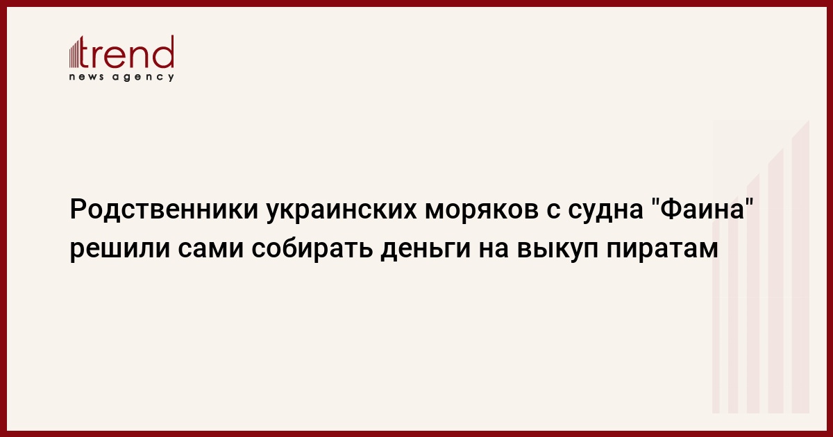 Родственники моряков судна "Фаина" приняли решение собирать деньги на выкуп сомалийским пиратам собственными силами. Об этом сообщила сегодня журналистам жена второго механика судна Елена Присуха, передает ИТАР-ТАСС.