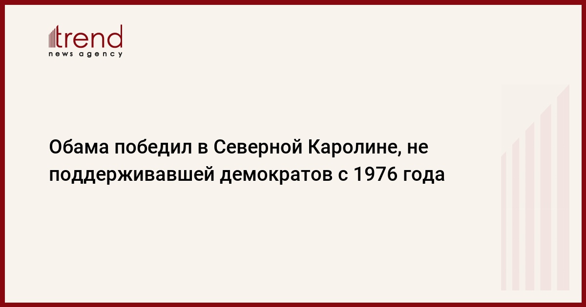 По официальным данным, в ходе президентских выборов в США кандидат от Демократической партии Барак Обама победил в штате Северная Каролина, традиционно поддерживавшем республиканцев. Ни один кандидат от демократов не мог получить большинства голосов избирателей штата с 1976г., передает Associated Press.