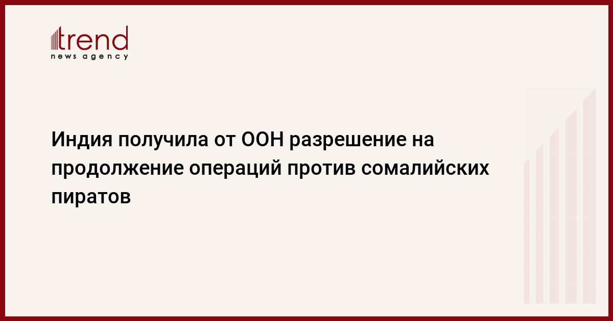 Индийские ВМС получили разрешение ООН на проведение операций против пиратов в сомалийских территориальных водах, сообщает в пятницу британская телерадиокорпорация Би-Би-Си.
