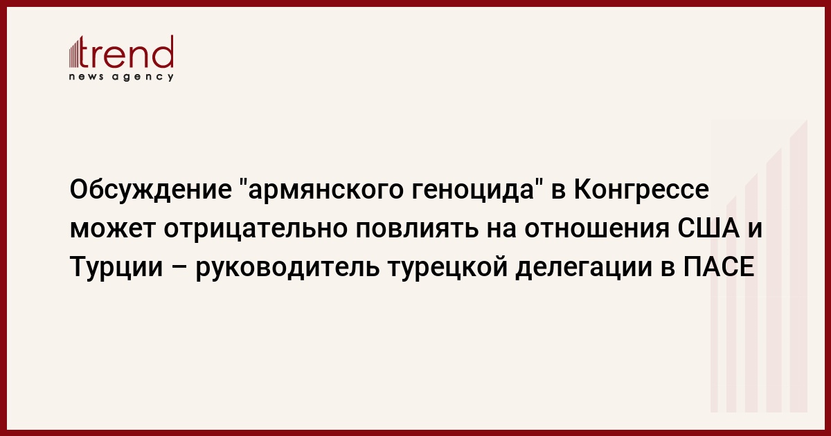 Руководитель турецкой делегации в Парламентской Ассамблее Совета Европы (ПАСЕ) Мурад Марджан в США в ходе встречи с представителями Конгресса сказал, что обсуждение в Конгрессе вопроса так называемого "геноцида армян" может отрицательно повлиять на отношения Анкары и Вашингтона. Об этом сообщил телеканал TRT Haber.