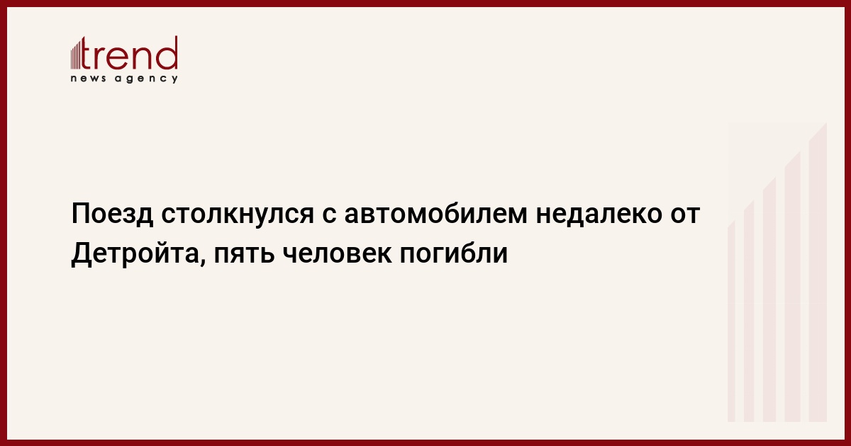 Пассажирский поезд столкнулся в четверг с автомобилем недалеко от Детройта, пять человек погибли, сообщает со ссылкой на местную полицию агентство Ассошиэйтед Пресс.