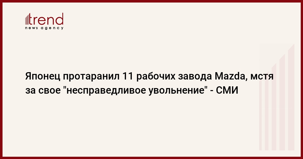 Житель Японии, который, предположительно, был уволен по сокращению с одного из заводов автомобильной компании Mazda Motor, во вторник из мести протаранил 11 работников автозавода Mazda, сообщает информационный портал Japan Today.