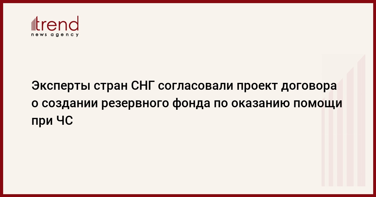 Эксперты стран СНГ согласовали проект Договора о создании резервного фонда СНГ по оказанию помощи государствам, пострадавшим при чрезвычайных ситуациях природного и техногенного характера, сообщили БЕЛТА в пресс-службе Исполкома СНГ.