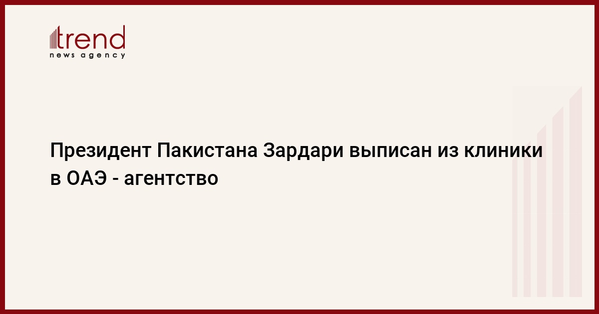Президент Пакистана Асиф Али Зардари был в ночь на четверг выписан из госпиталя в ОАЭ, где он проходил лечение после сердечного приступа, передает агентство APP со ссылкой на представителя главы государства Фархатуллу Бабара (Farhatullah Babar), сообщает РИА "Новости".