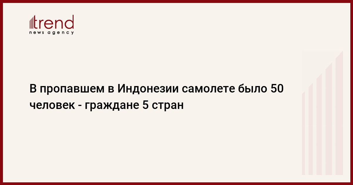 На борту пропавшего в Индонезии самолета SSJ-100 было 50 человек: 8 россиян, 2 итальянца, француз, американец и 38 граждан Индонезии, сообщил РИА Новости представитель кризисного штаба в аэропорту Джакарты.