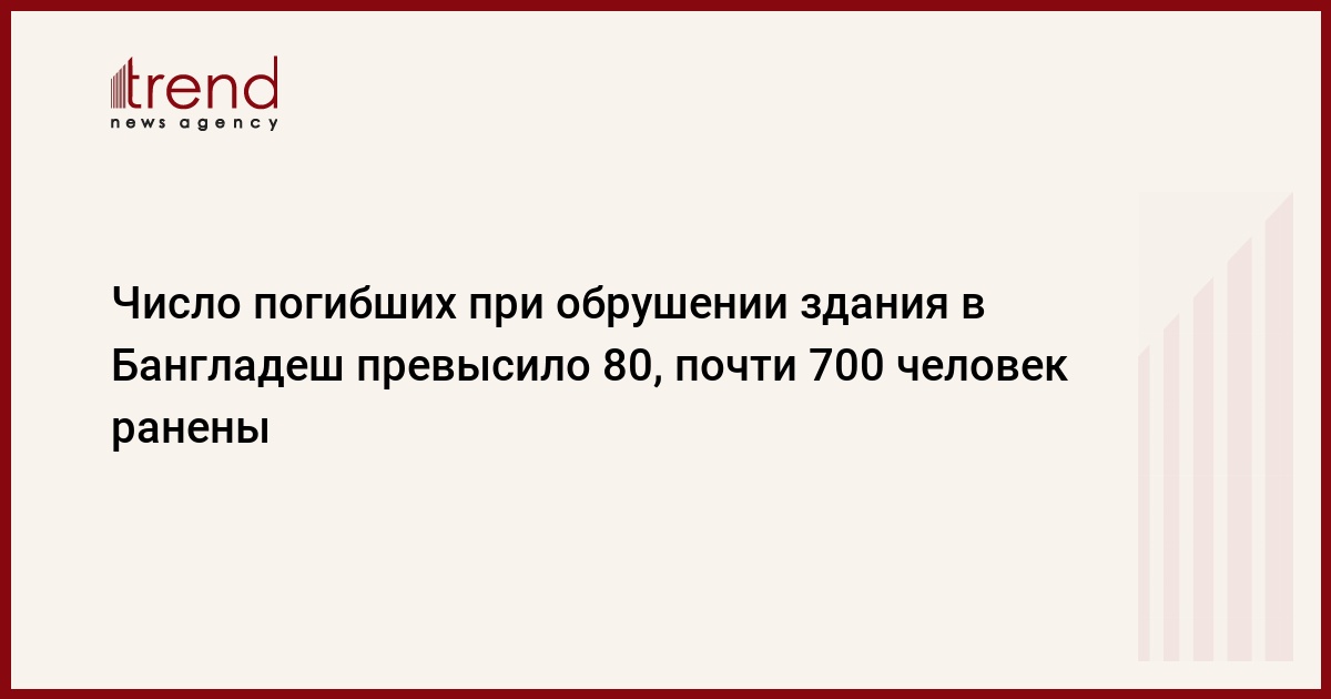 Медики сообщают о 82 погибших при обрушении восьмиэтажного здания в пригороде столицы Бангладеш Дакки, около 700 пострадавших доставлены в больницу, сообщает в среду РИА Новости со ссылкой на агентство Франс Пресс.