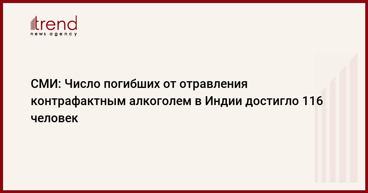 Число погибших из-за отправления контрафактным алкоголем в штатах Уттар-Прадеш и Уттаракханд на севере Индии достигло к понедельнику 116 человек. Как сообщает газета Times of India, еще не менее 16 пострадавших находятся в критическом состоянии, передает Trend со ссылкой на ТАСС.