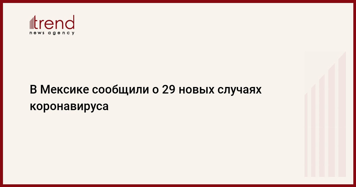 Генеральный директор службы профилактики минздрава Мексики Рикардо Кортес заявил о 29 новых случаях коронавируса, которые зафиксированы за последние сутки, общее число заболевших составляет 82 человека, передает Trend со ссылкой на РИА Новости.