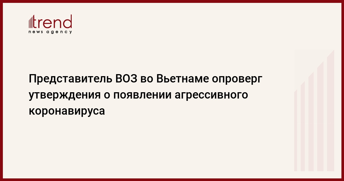 Появление новых случаев заражения коронавирусом в третьем по величине городе Вьетнама Дананге не вызывает серьезных опасений, поскольку вирулентность этого штамма ничем не отличается от вируса, встречающегося в других странах. Об этом, как передает Trend со ссылкой на ТАСС, заявил представитель Всемирной организации здравоохранения (ВОЗ) во Вьетнаме Пак Кидонг .