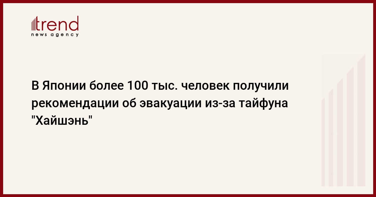 Более 100 тыс. жителей японской префектуры Миядзаки на юго-западе страны получили рекомендации об эвакуации из-за приближающегося тайфуна "Хайшэнь". Об этом в воскресенье сообщило японское общественное телевидение, передает Trend со ссылкой на ТАСС.