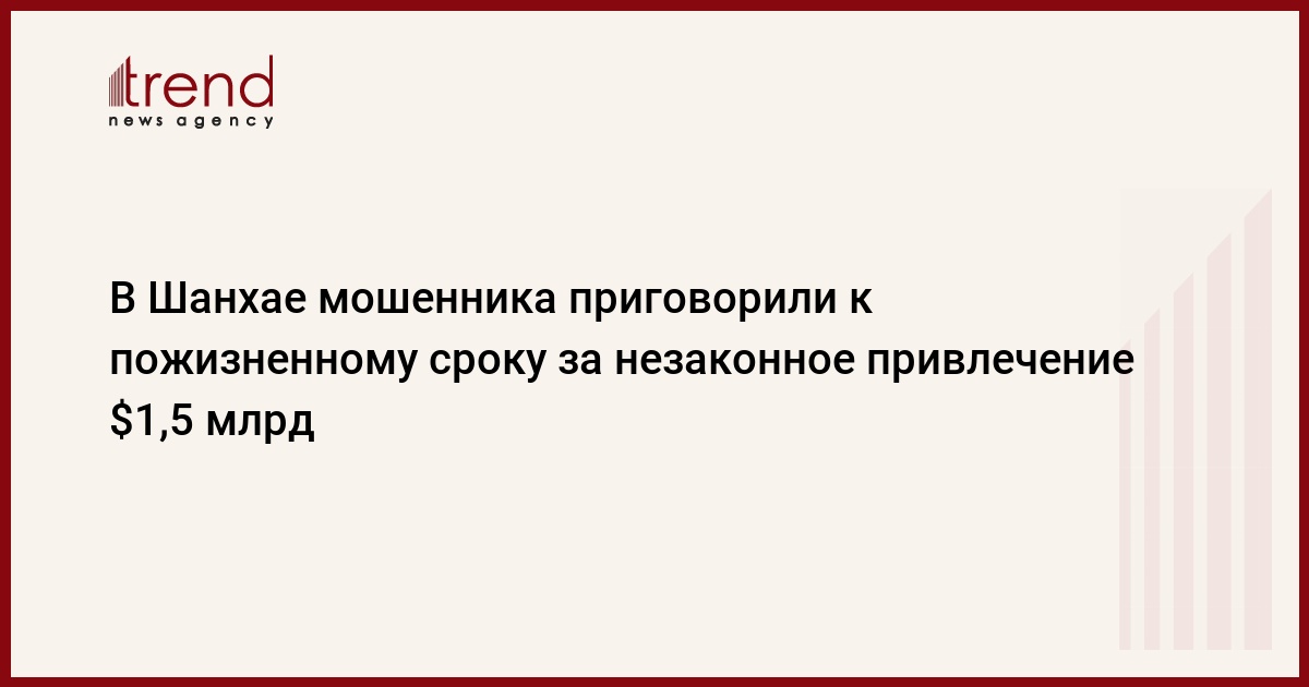 Главный фигурант дела об организации финансовой мошеннической схемы в Шанхае был приговорен судом к пожизненному заключению за обман инвесторов и незаконное привлечение капитала на сумму свыше 9,93 млрд юаней (около $1,52 млрд). Соответствующее решение вынес во вторник городской народный суд средней ступени номер один. Как передает Trend со ссылкой на ТАСС, об этом сообщает местный информационный ресурс "Пэнпай".