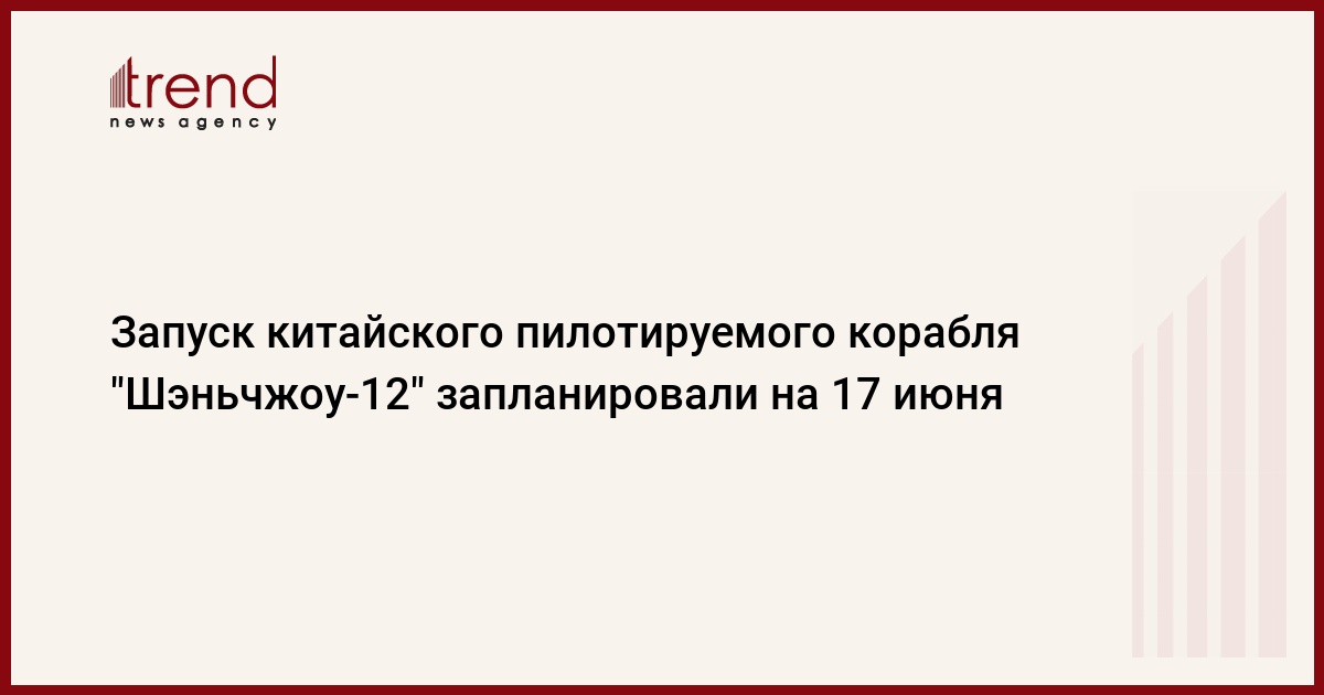 Китайское национальное космическое управление (CNSA) 17 июня планирует осуществить запуск корабля "Шэньчжоу-12" к орбитальной станции КНР. Об этом сообщило в среду Управление программы пилотируемых космических полетов КНР, передает Trend со ссылкой на ТАСС.