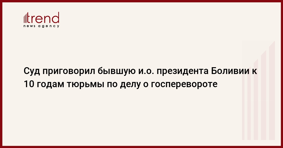 Суд признал бывшую исполняющую обязанности президента Боливии Жанин Аньес виновной по делу о госперевороте и приговорил ее к 10 годам тюрьмы. Оглашение вердикта транслировалось на сайте газеты Pagina Siete, передает Trend со ссылкой на ТАСС.