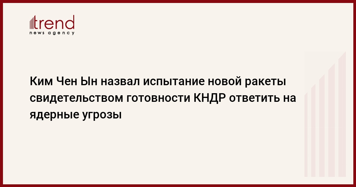 Лидер КНДР Ким Чен Ын заявил, что осуществленное накануне испытание новой межконтинентальной баллистической ракеты (МБР) "Хвасон-17" стало свидетельством готовности Северной Кореи соответствующим образом отреагировать на ядерные угрозы. Об этом, как передает Trend со ссылкой на Интерфакс, сообщило в субботу Центральное телеграфное агентство Кореи (ЦТАК).