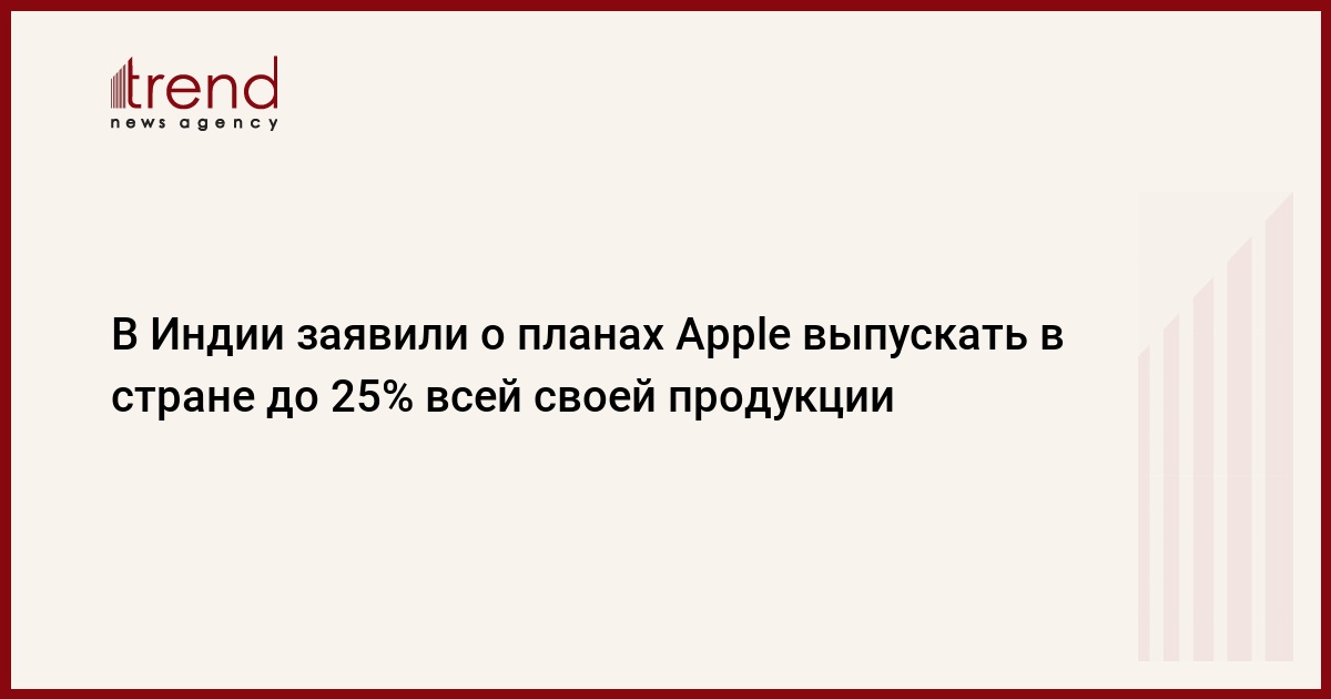 Корпорация Apple намерена выпускать в Индии 25% всей своей продукции. Об этом в понедельник заявил министр торговли и промышленности Индии Пиюш Гоял, передает Trend со ссылкой на ТАСС.