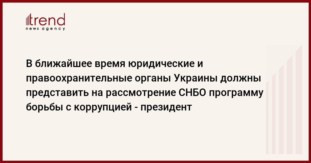 В ближайшее время юридические и правоохранительные органы Украины должны представить на рассмотрение Совета национальной безопасности и обороны страны общенациональную программу борьбы с коррупцией. Как передает собкор " Trend а" в Киеве, об этом сегодня заявил президент Украины Виктор Ющенко в своем выступлении на заседании СНБО в Киеве.