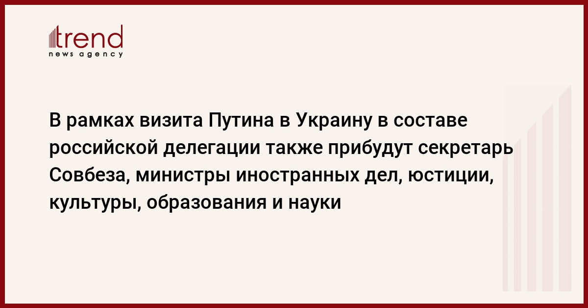 В рамках визита президента Российской Федерации Владимира Путина, в составе российской делегации в Украину также прибудут секретарь Совета безопасности Игорь Иванов, министр иностранных дел Сергей Лавров, министр юстиции Владимир Устинов, министр образования и науки Андрей Фурсенко и министр культуры Александр Соколов и другие.