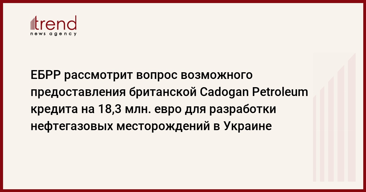 Европейский банк реконструкции и развития рассмотрит вопрос возможного предоставления Cadogan Petroleum (Великобритания) кредит на 18,3 млн. евро для разработки газовых и нефтяных месторождений в Украине.