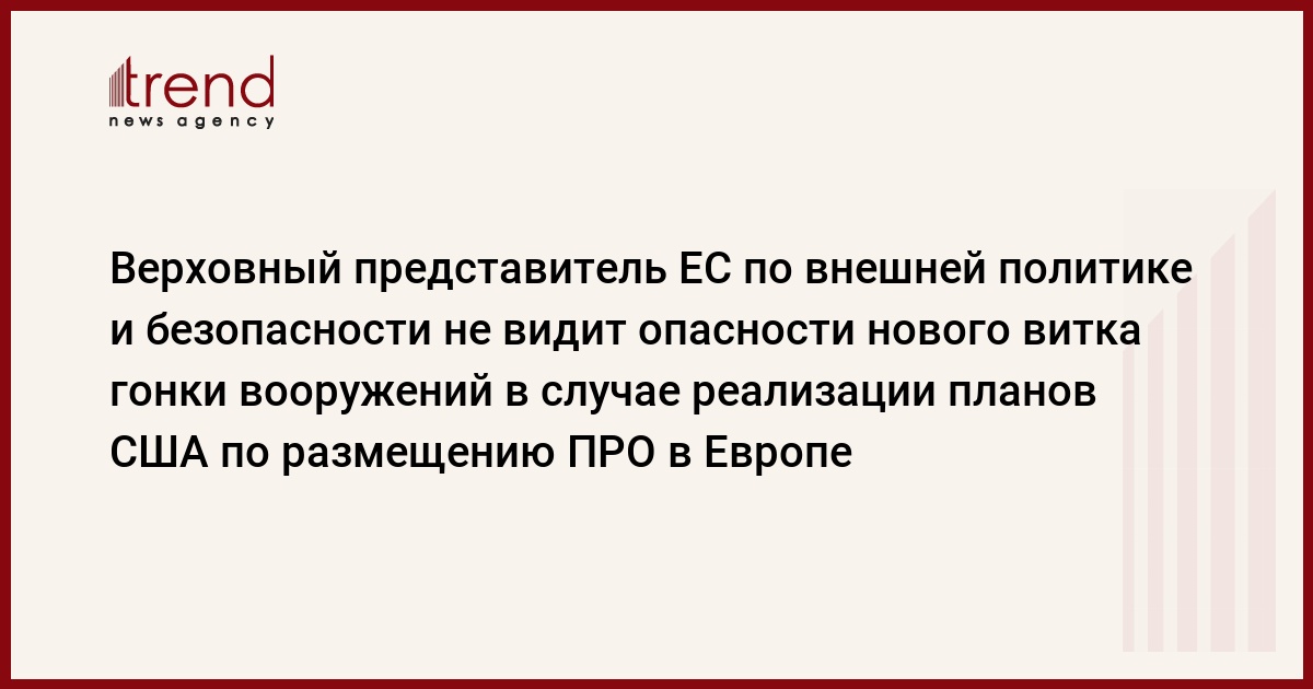 Верховный представитель ЕС по внешней политике и безопасности не видит опасности нового витка гонки вооружений в случае реализации планов США по размещению ПРО и РЛС в Восточной Европе, передает Deutsche Welle .