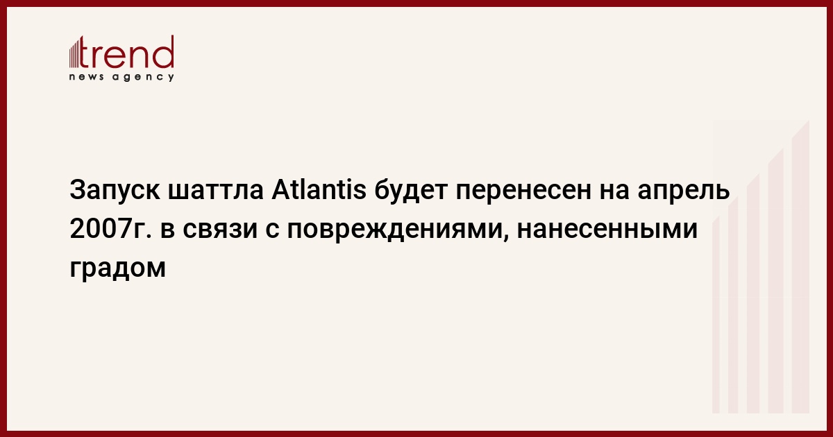 Сильный град повредил топливный бак космического шаттла Atlantis, стоявшего на стартовой площадке космодрома на мысе Канаверал (штат Флорида), сообщило Национальное управление США по аэронавтике и исследованию космического пространства (NASA).