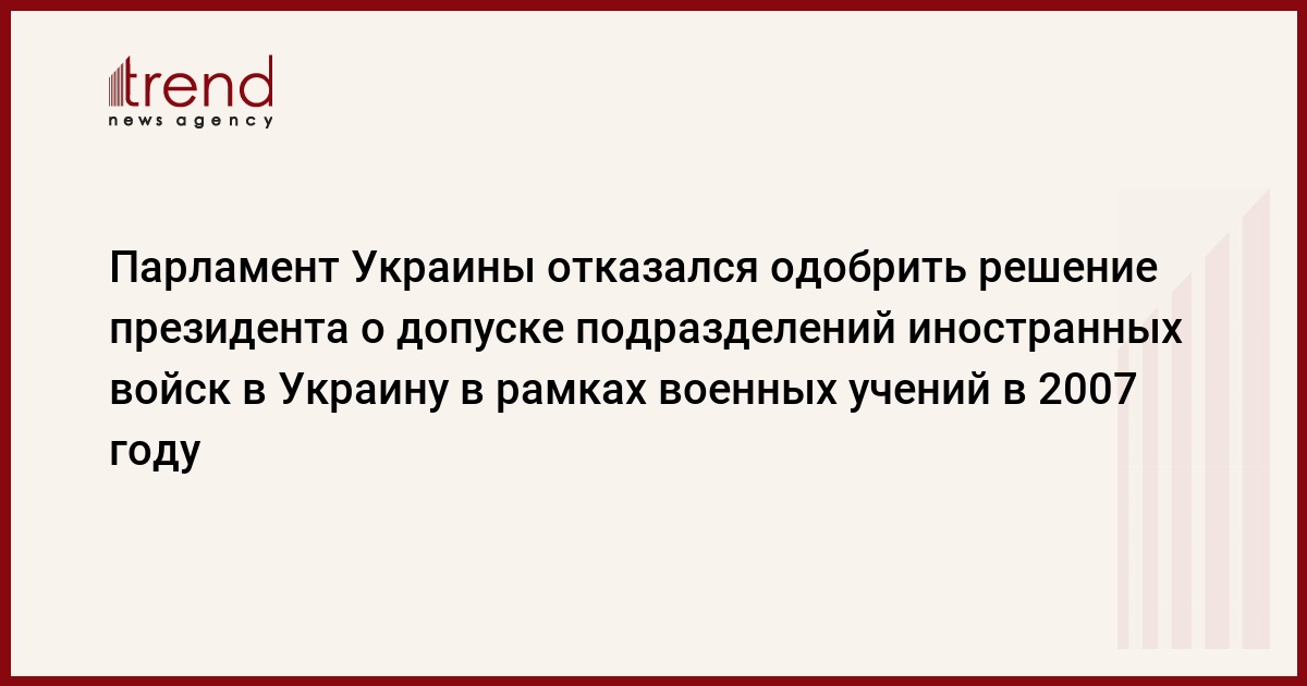 Украина, Киев /корр. Trend З.Новосвитский/ Верховная Рада Украины отказалась поддержать проект закона об одобрении решения Президента о допуске подразделений вооруженных сил других государств на территорию Украины в 2007 году для участия в многонациональных военных учениях.