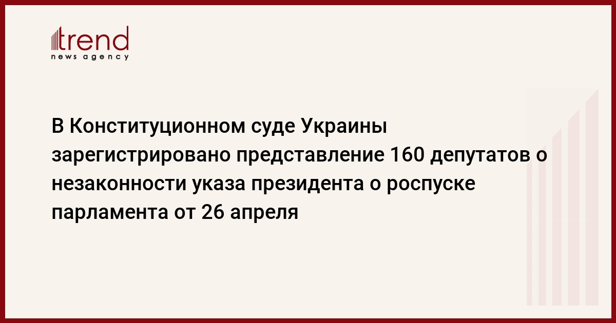 Украина, Киев /корр. Trend З.Новосвитский/ Сегодня в Конституционном суде Украины (КС) зарегистрировано представление 160 народных депутатов Украины о неконституционности указа президента Украины Виктора Ющенко от 26 апреля "О досрочном прекращении полномочий Верховной Рады Украины и назначении внеочередных выборов". Об этом сообщает пресс-служба Партии регионов Украины.