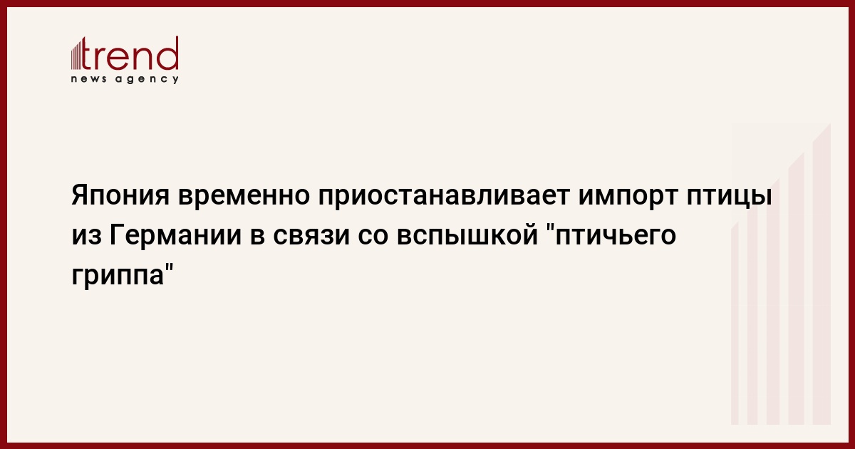 Япония временно приостанавливает импорт птицы из Германии в связи со вспышкой "птичьего гриппа" в ФРГ. Японское Министерство сельского хозяйства подчеркнуло, что эта мера необходима лишь для предотвращения распространения вируса и не связана с опасениями относительно качества германской продукции. Токио попросил Берлин предоставить наиболее полную информацию о вспышке, передает РБК со ссылкой на Associated Press.