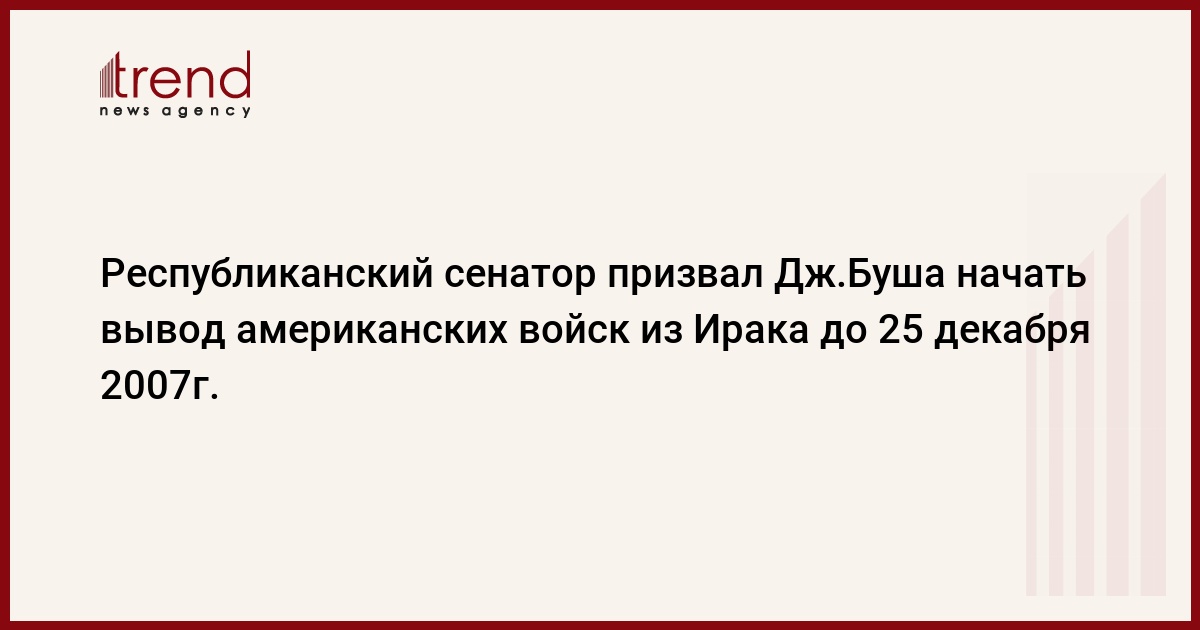 Сенатор от штата Вирджиния и советник Белого дома по военным вопросам республиканец Джон Уорнер предложил президенту США Джорджу Бушу начать вывод американских войск из Ирака уже к этому Рождеству - 25 декабря 2007г. По мнению советника, этот шаг должен стать "ясным и прямолинейным" предупреждением иракскому правительству о необходимости скорейших шагов по