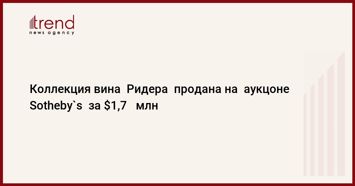 , Лариса Саенко. Коллекция вина из погребов Томаса Ридера , издателя и бывшего исполнительного директора медийной ассоциации " Reader's Digest Assosiation ", владеющего также рядом элитных ресторанов и отелей, продана в пятницу вечером на аукционе Sotheby's за 1,7 миллиона долларов, сообщил торговый дом, передает РИА "Новости" ,