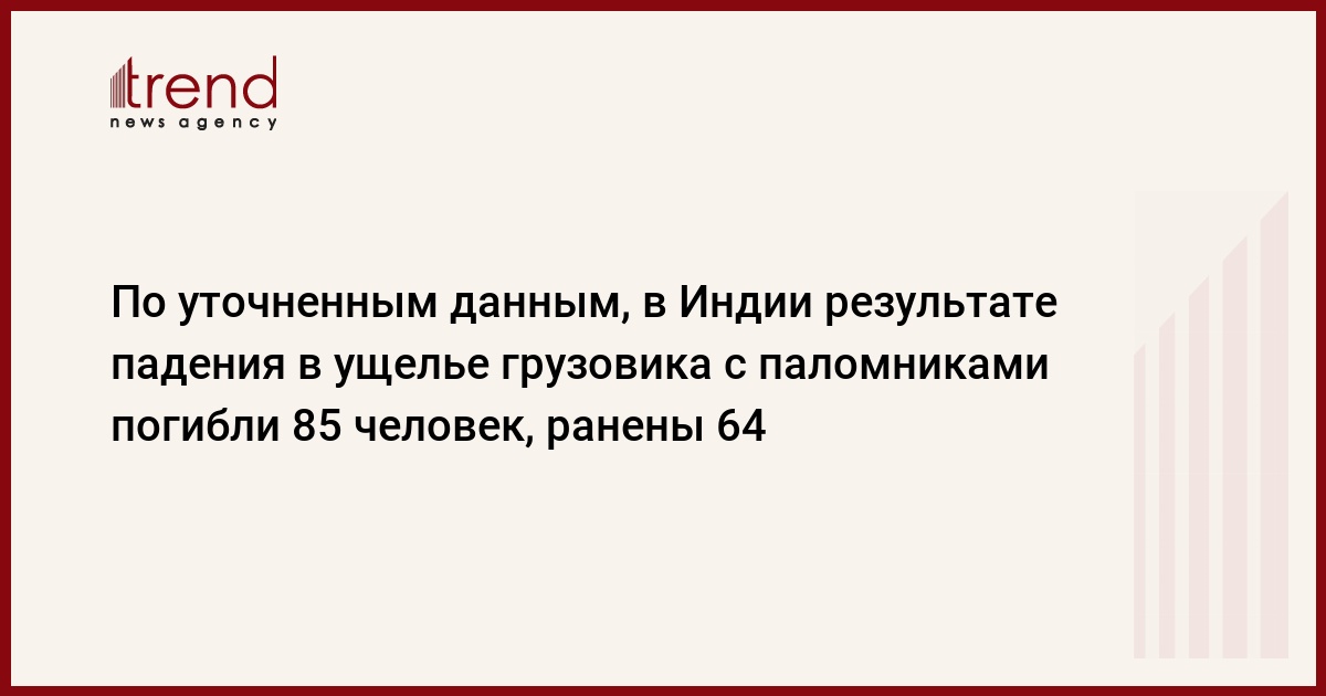 По уточненным данным, в Индии результате падения в глубокое ущелье перевозившего паломников грузовика погибли, по меньшей мере, 85 и получили ранения 64 человека, передает Associated Press со ссылкой на заявление полиции. К настоящему моменту спасателям удалось обнаружить 85 тел погибших и 64 раненых, передает РБК .