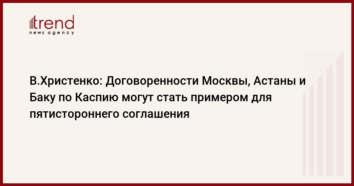 Договоренности по вопросам о разделе Каспия, достигнутые между Россией, Казахстаном и Азербайджаном, могут стать хорошим примером для пятистороннего соглашения с участием Ирана и Туркмении, заявил сегодня журналистам в г.Висбадене министр промышленности и энергетики Виктор Христенко. "Теперь есть, чем подкрепить достигнутые позиции России,Казахстана и Азербайджана", - отметил он. Говоря непосредственно о трехсторонних договоренностях, В.Христенко подчеркнул: "Это не некая абстрактная правовая и дипломатическая формула, а конкретное завоевание, которое должно стать хорошим аргументом для наших партнеров", передает РБК .В то же время глава Минпромэнерго отметил, что главная проблема Каспия "не в том, как его делить, а как сделать общее пространство для судоходства, рыбного промысла и добычи углеводородов". "В этом смысле, речь, в первуюочередь, идет о разделе ответственности за судьбу Каспия, которая лежит на странах Прикаспийского региона", - заключил он.Напомним, Россия, Казахстан и Азербайджан выступают за раздел пространства для добычи минеральных ресурсов в соответствии с береговой линией, а Иран предлагает поделить Каспий на пять равных частей.