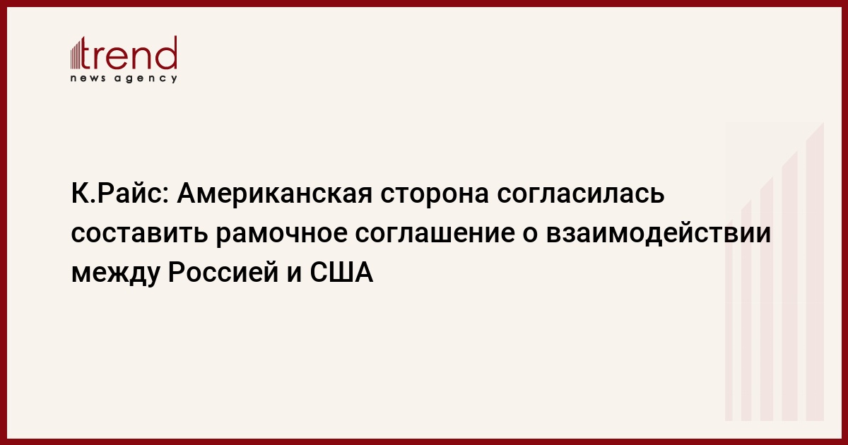 Госсекретарь США К.Райс на пресс-конференции в Москве по итогам переговоров с главой МИД РФ Сергеем Лавров заявила о том, что американская сторона согласилась составить рамочное соглашение между Россией и США, передает РБК. Она отметила, что это соглашение не является договором, это документ, признающий "всю широту взаимодействия между Россией и США" и создающий основу для российско-американских отношений. "Мы договорились о тех элементах, которые будут включены в это соглашение и по которым мы не могли прийти к согласию в течение нескольких лет. В частности, это борьба с ядерным терроризмом, а также предоставление обеспеченного доступа к ядерному топливу стран, которые хотят использовать его в мирных целях", - заявила госсекретарь США. Она также добавила, что стороны обсудили, что делать после того, как истечет срок договоров о стратегических наступательных вооружениях (СНВ-1) и о сокращении стратегических наступательных потенциалов (СНП). "Элементы согласия существуют, но нужно продолжать дискуссию", - заключила К.Райс.