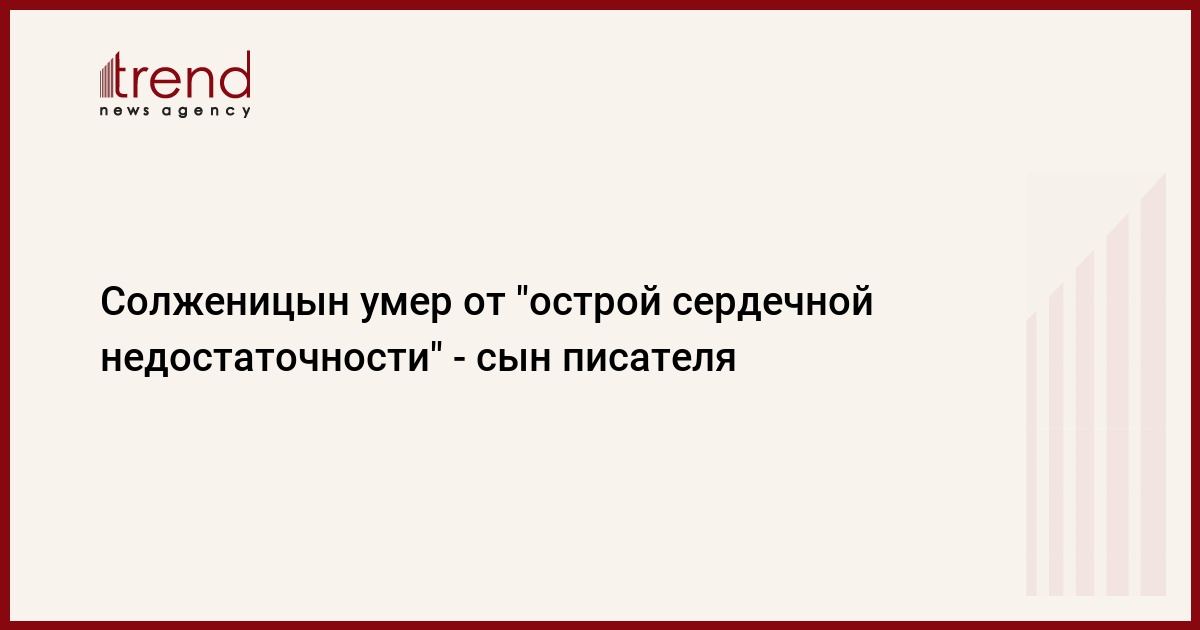 Александр Солженицын умер от сердечной недостаточности. Как сообщил ИТАР-ТАСС сын покойного Степан, Александр Исаевич умер дома. По его словам причиной смерти стала "острая сердечная недостаточность". Смерть наступила в 23.45 мск в воскресенье.